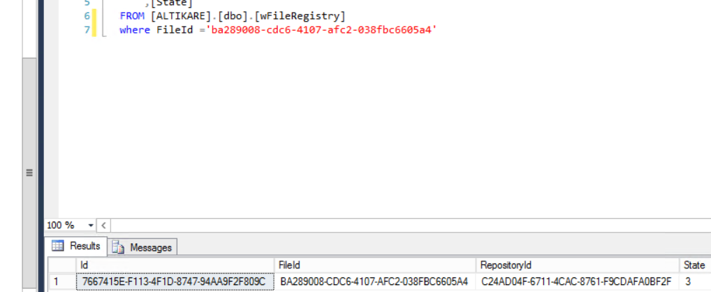 Aldığımız Id yi veritabanında wFileRegistry tablosunda aratıyoruz ve durumunu (state) kontrol ediyoruz. Eğer State 3 ise 0 olarak güncelliyoruz.