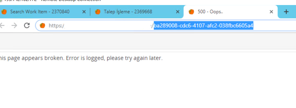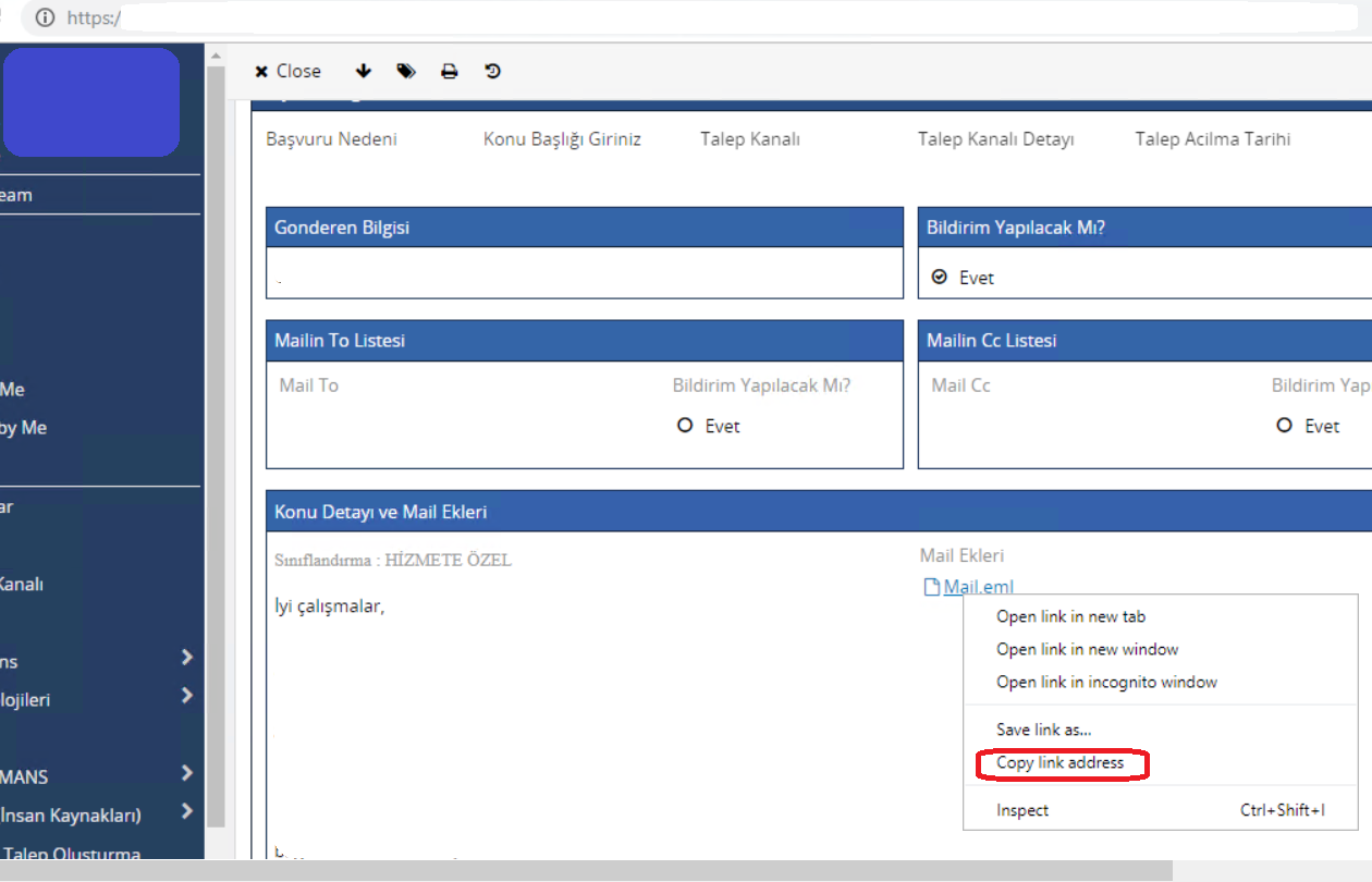 Öncelikle talep numarasını (instance number) temin ediyoruz. Müşteri Emakin den İş adımı ara kısmından aratıyoruz. Talebin içine girdiğimizde Mail ekleri kısmındaki dosyaya tıklıyıp açılıp açılmadığını (veya indirildiğini) gözlemliyoruz. 500 hatası veriyorsa geri gelip dosya üzerine sağ tıklayıp copy link address diyoruz. (Çözüm Katılım’daki hataya göre oluşturulduğundan farklı müşterilerde dosyalar farklı alanlarda olabilir)